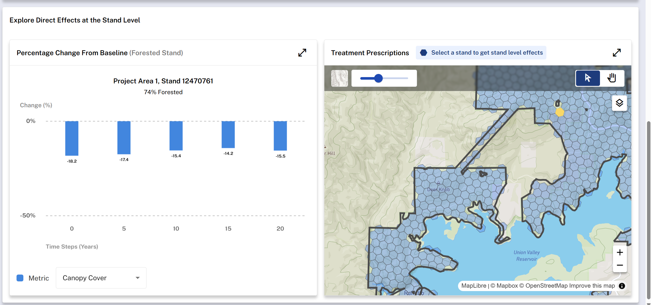 Once a stand is selected, this graph provides a detailed stand-level view of direct effects based on treatment type and landscape characteristics.