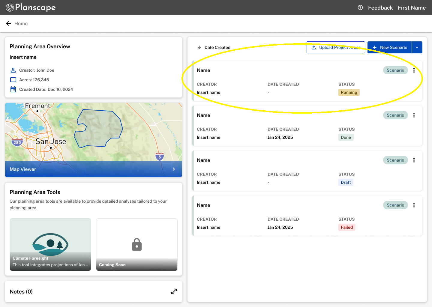 - Scenario Tag: This helps you define whether your project areas are a result of an upload or a scenario ran in Planscape.