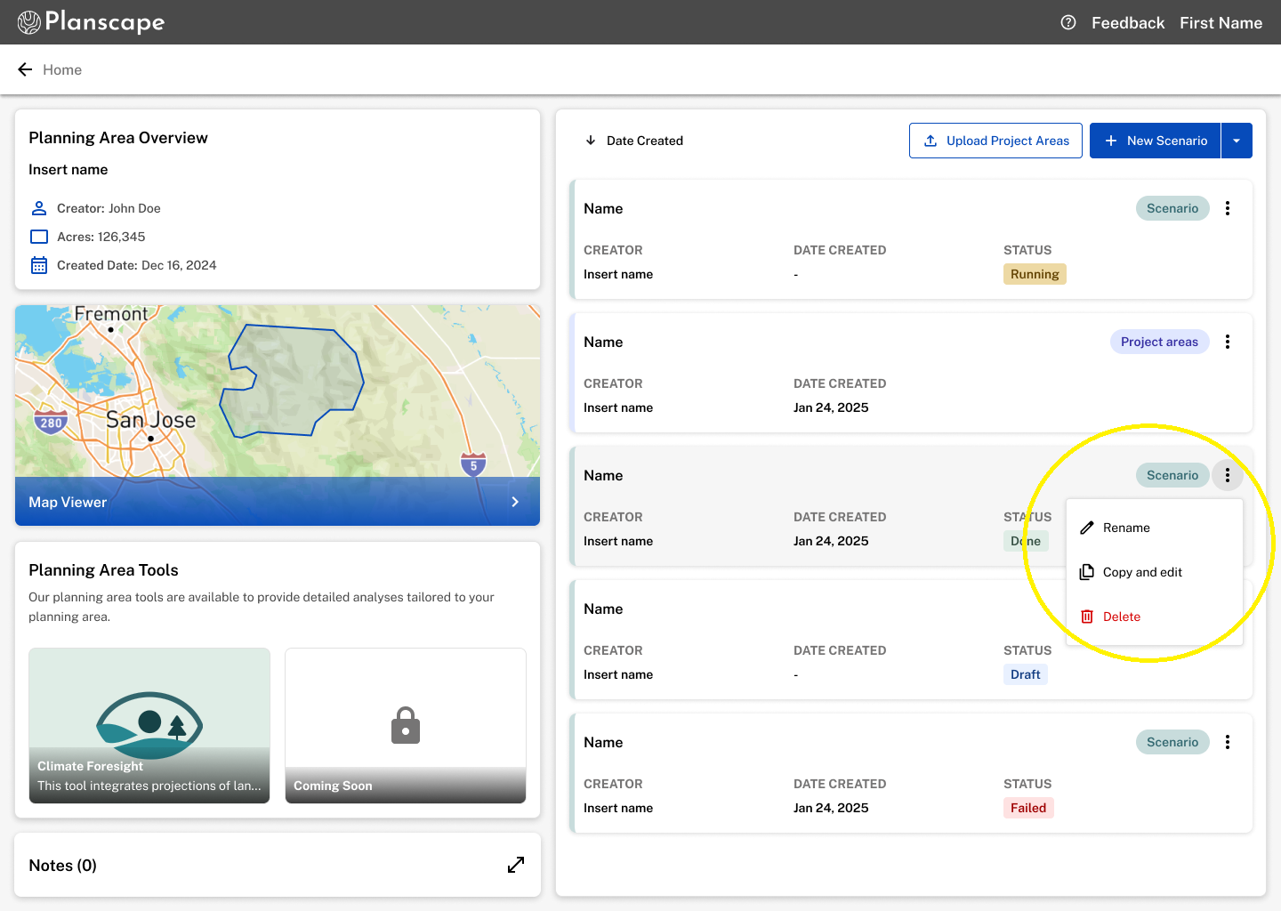 Every scenario you create appears as a card on your planning area overview page. Feel free to build as many as you need and you can sort them by date for easy access.