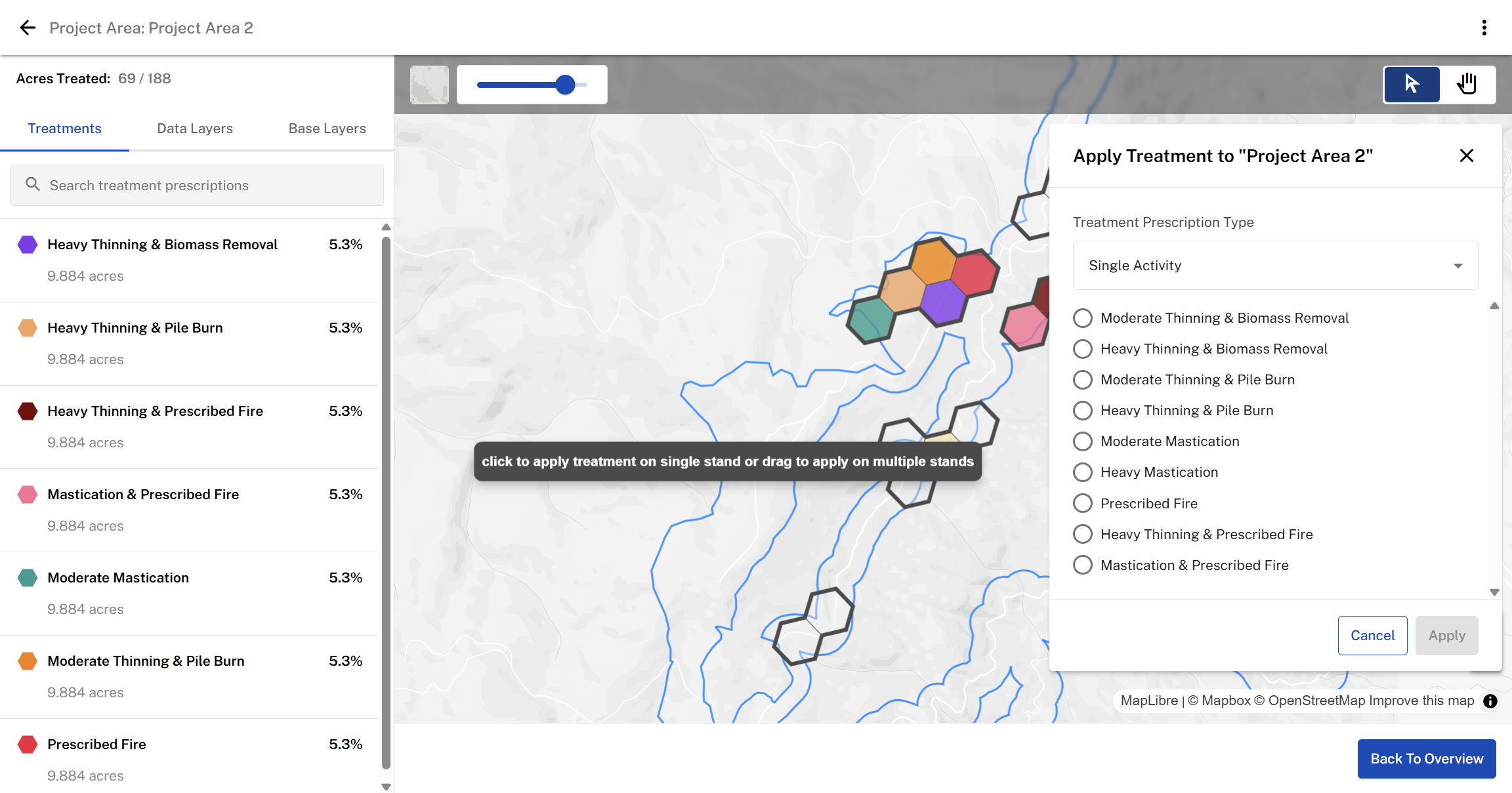 Select a Project Area: Click on a project area on the map or from the project area list. This will zoom into the selected area, allowing you to start applying treatments.